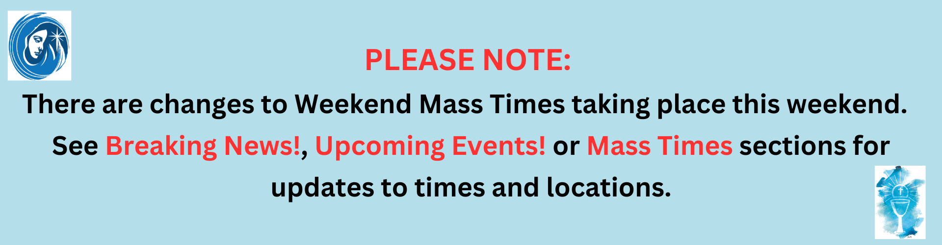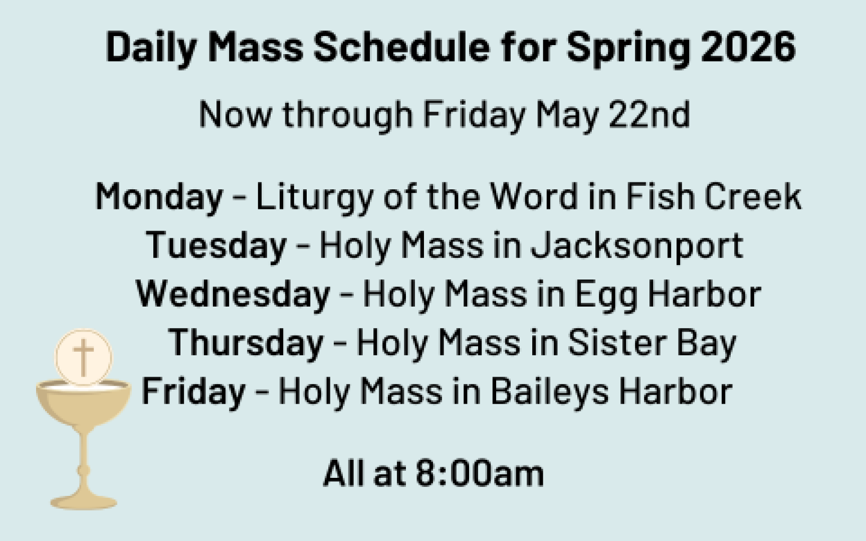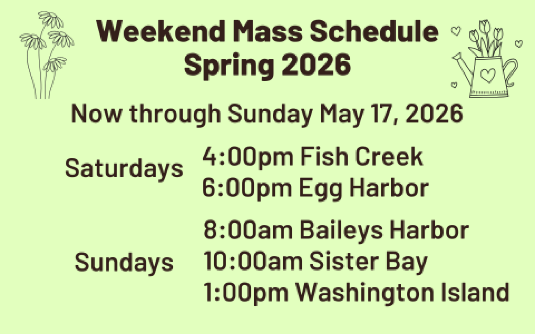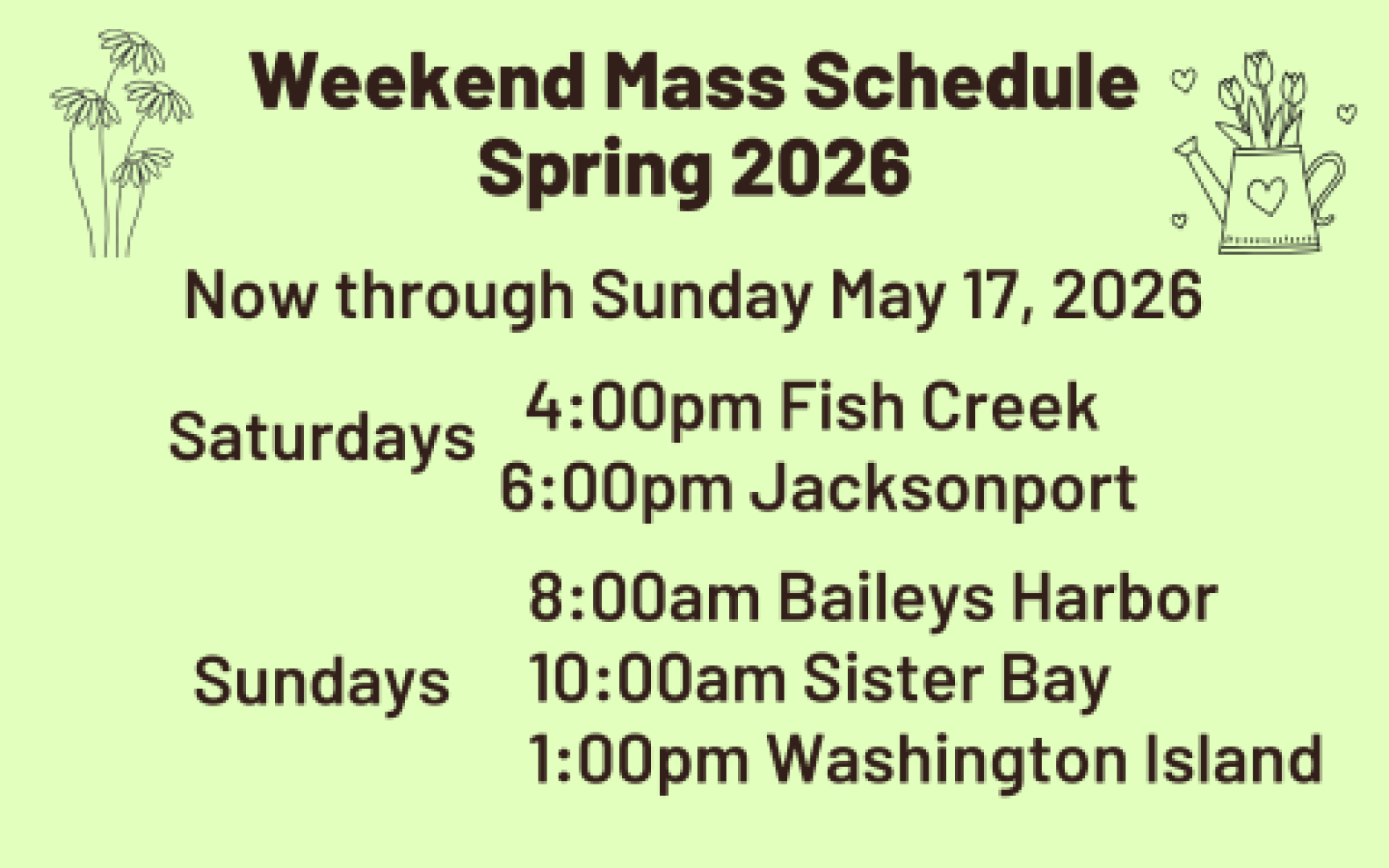 SPRING WEEKEND MASS SCHEDULE - Our Spring Weekend Mass schedule begins on Saturday April 18th and runs through Sunday May 17th, 2026. Saturday Masses will be celebrated at 4:00pm in Fish Creek and 6:00pm in Jacksonport. Sunday Masses will be celebrated at 8:00am in Baileys Harbor, 10:00am in Sister Bay and at 1:00pm on Washington Island. Please plan accordingly and join us!