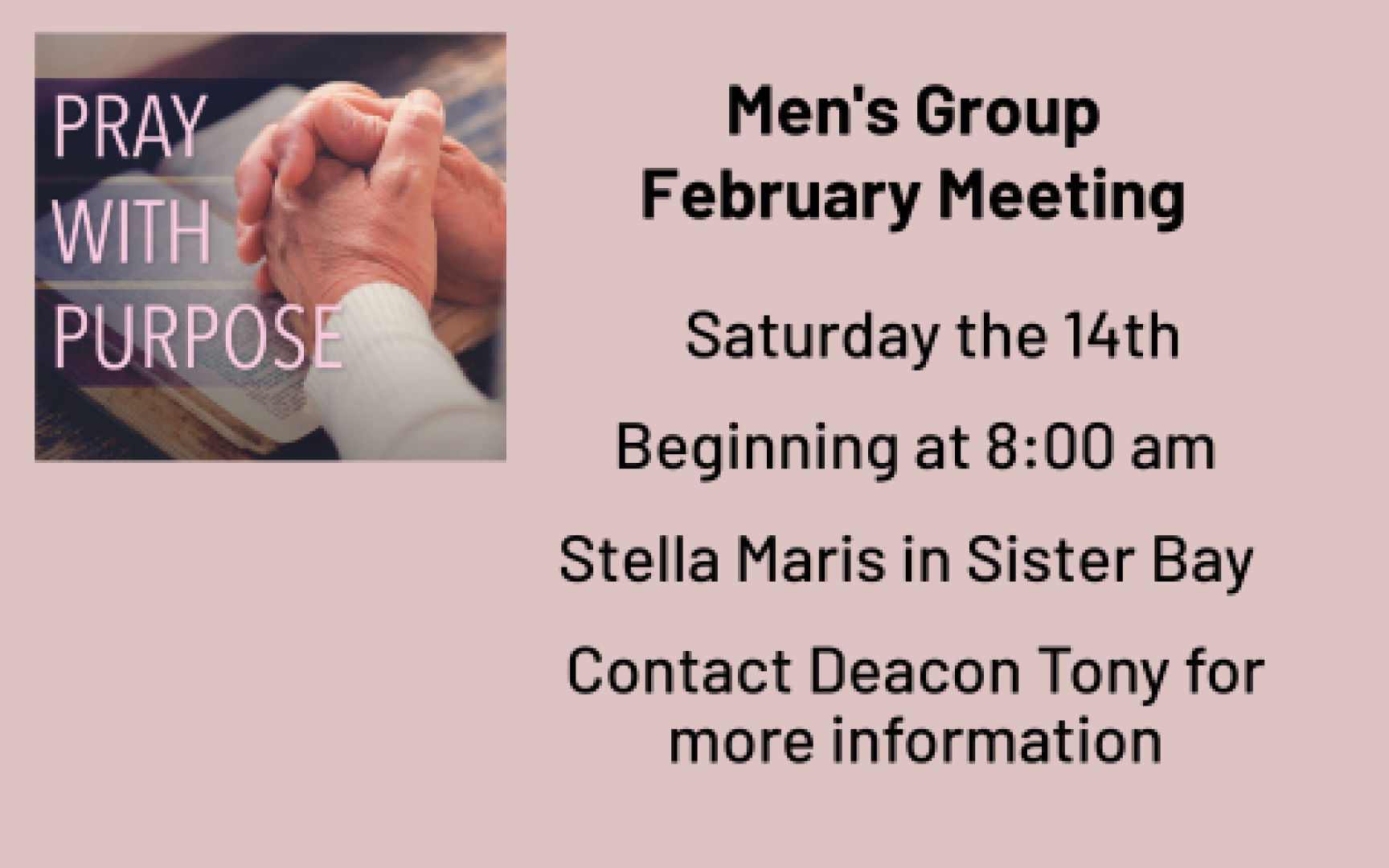 JOIN A SMALL GROUP FOR LENT - This year for Lent, our small groups will be using the video series The Search from the Augustine Institute.  The Search leads people to the deeper questions of the human heart, exploring the meaning and purpose of life with a visually stunning and intellectually stimulating approach.  We will be digging deep into life and death, sorrow and happiness and science and faith. Please join us starting February 15th for this 7 week series.  Sessions will be offered on Sundays at 6:00pm in Sister Bay, on Mondays at 9:30am via Zoom or on Wednesdays at 9:30am in Egg Harbor.  Call Angela at (920) 868-3241 to register for a group or for more infromation.