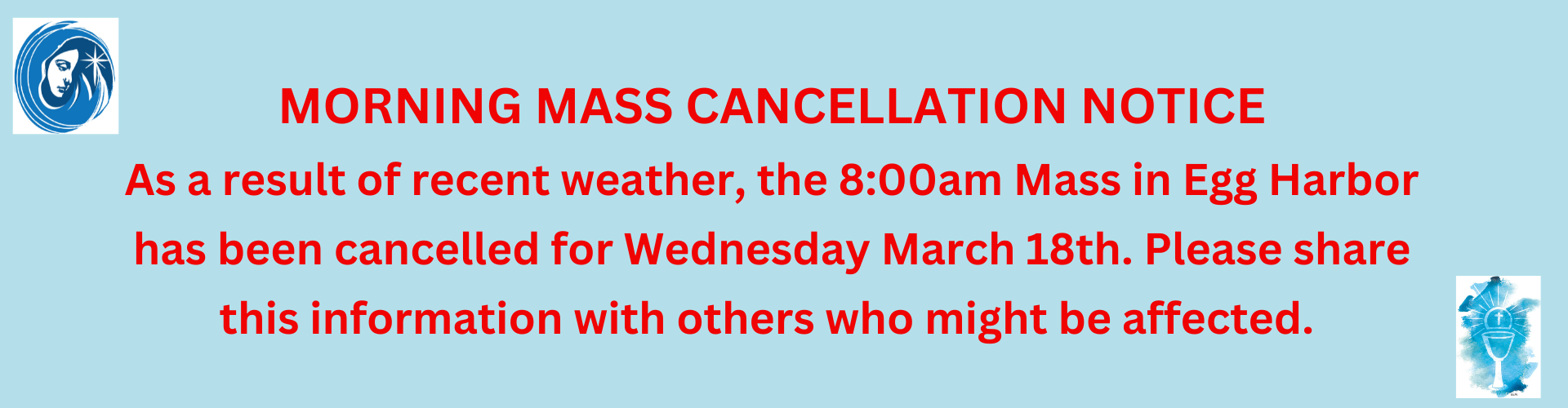MORNING MASS CANCELLATION NOTICE - As a result of recent weather, the 8:00am Mass in Egg Harbor has been cancelled for Wednesday March 18th. Please share this information with others who might be affected.